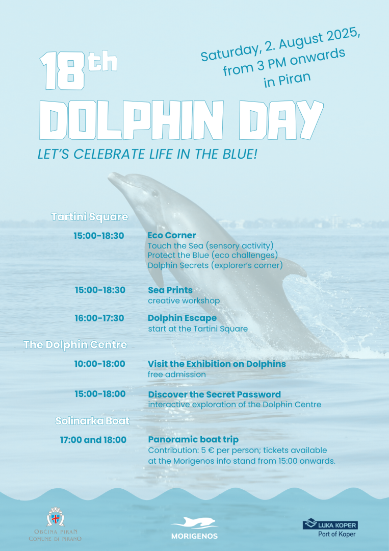 Morigenos – die slowenische Gesellschaft für Meeressäugetiere – lädt euch herzlich ein, auch dieses Jahr wieder den traditionellen Delfintag mit uns zu feiern. In Piran erwartet euch ein abwechslungsreiches Programm, mit dem wir auf den Schutz der Delfine und ihres Lebensraums im Meer aufmerksam machen möchten.