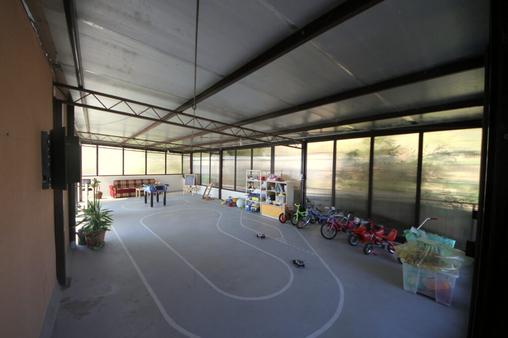 A standout feature of the property is the spacious covered children’s playroom with toys, a large terrace for relaxing, and access to the garden and barbecue.
