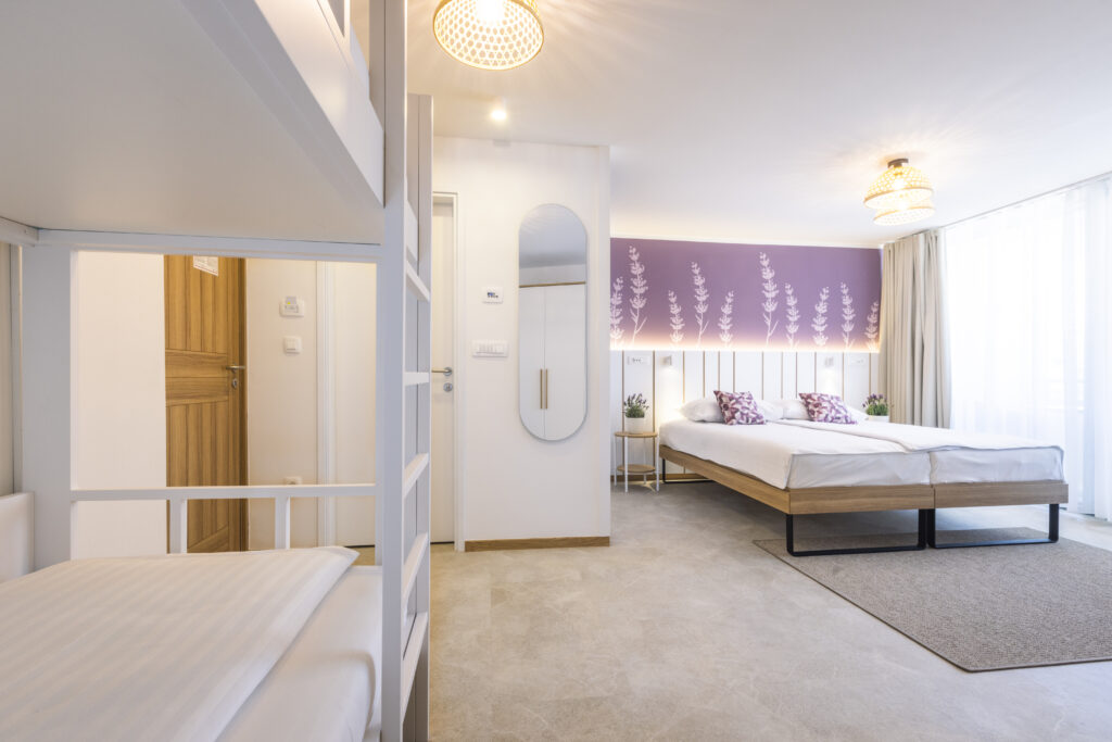 - Beds: 1 double bed (180 x 200 cm) or 2 single beds (90 x 200 cm) + bunk bed (90 x 200 cm) or sofa (80 x 190 cm)