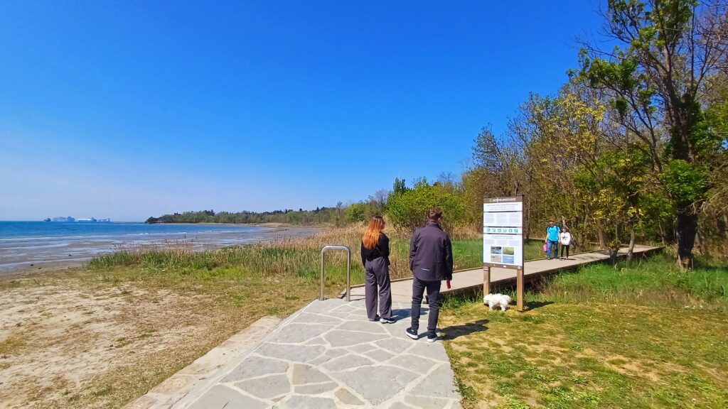 From there, you descend towards the coast, where a wooden educational boardwalk awaits – a special observation path crossing the Mediterranean Salt Meadow, a natural site of national importance included in the Natura 2000 network due to its unique flora and fauna.