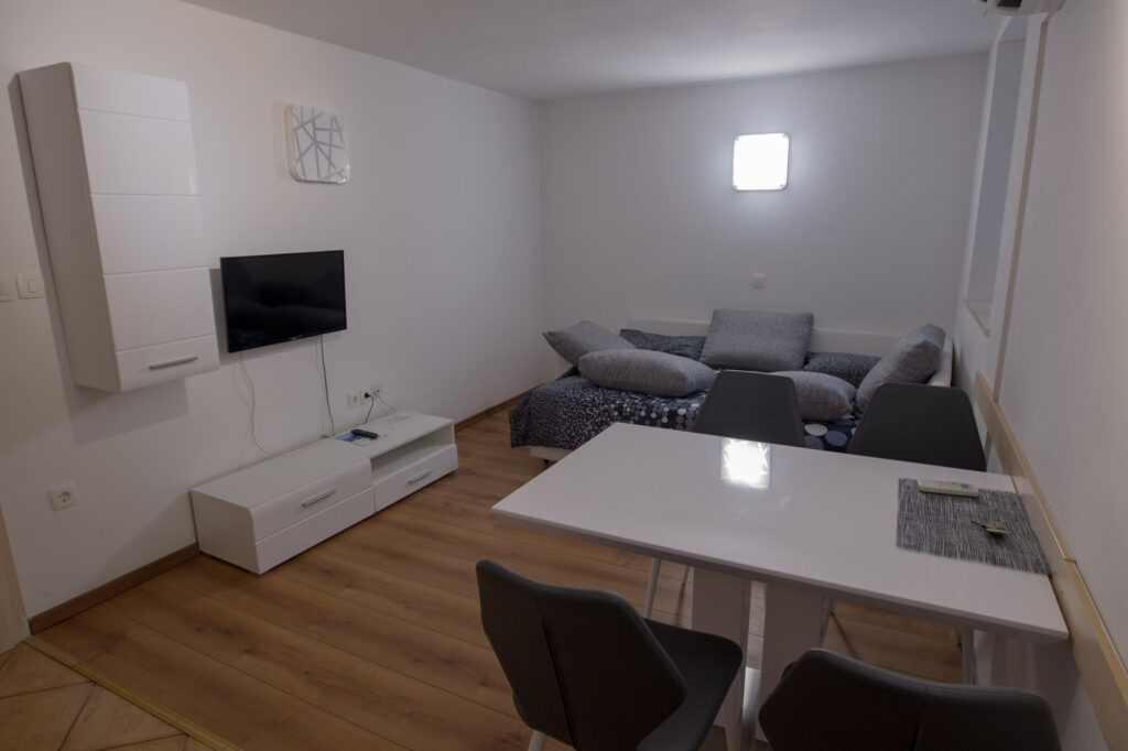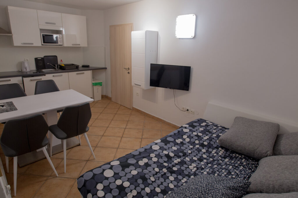 - Layout: Studio (1 room) with a double bed, a smaller extra bed, kitchen, and dining area