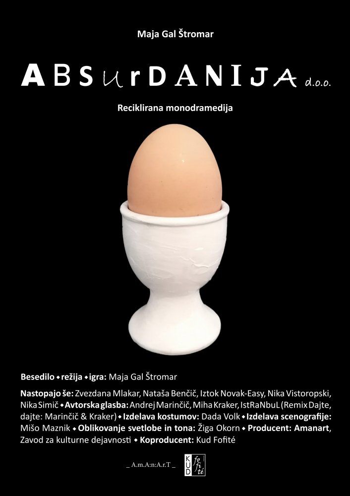 Iz gledališkega lista: Absurdanija d.o.o. je avtoričina druga izvirna monodrama, v kateri si domišlja, da se loteva resnih tematik, kot so (post)kovidna histerična realnost, influencerska brezosebna spletna omniprezenca, klikabilnost, kulturni kretenizem, politični oportunizem in še kaj. Sprašujemo se, ali se nam bo izšlo. Oprostite, toda izšlo kaj? Morda pa se tega niti sprašujemo ne več. V udobju otopelosti strmimo v belo piko, prajajce, iz katerega se bojda rodi pišče, iz katerega se bojda razvije kokoš, iz katere se bojda rodi jajce, iz katerega… In čakamo, da našo zgodovino izpiše nekdo drug. Umetnost, pravijo, je preslikava življenja, zato se na tem mestu opravičujemo, če se vam bo zdela predstava banalna, absurdna, plehka in predvidljiva, njena vsebina razvlečena in krhka, dramaturški loki polomljeni, ritem dvomljiv, igralka neprepričljiva. Režije pa itak ni, ker ni bilo denarja. Who cares. In končno, kdo je rekel, da gre za umetnost? Zakaj bi bili odgovorni, če je odgovornost že davno odšepala v domeno luzerjev in odpikanih idealistov.
