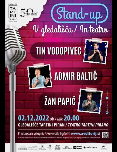 V petek, 2.12. 2022 ob 20. uri bo na odru Gledališča Tartini Piran uprizorjena celovečerna stand-up komedija, na kateri bodo nastopili in z domislicami ter štosi občinstvo nasmejali Tin Vodopivec, Admir Baltić in Žan Papič.