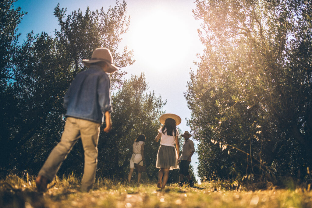 Prejeli boste dekico ter piknik košarico z izbranimi dobrotami – od domačih tapenad in caprese solate do svežega domačega kruha in soka. Tako si lahko sami ustvarite svoj miren kotiček v oljčniku ter degustirate domače izdelke ob čudovitem razgledu. Doživetje je primerno tudi za družine z otroki, saj ponuja sproščeno druženje v naravi. Če želite svoj piknik dopolniti še s kozarcem vina, lahko v trgovinici kupite ohlajeno steklenico in jo vzamete s seboj med oljke.