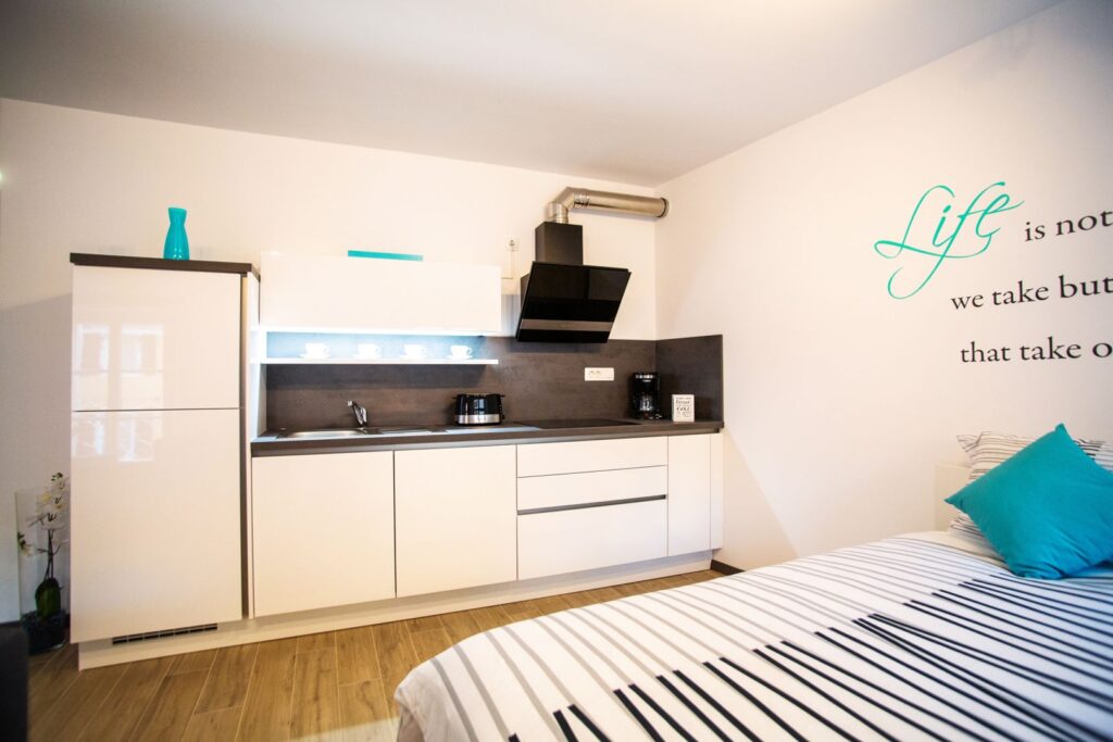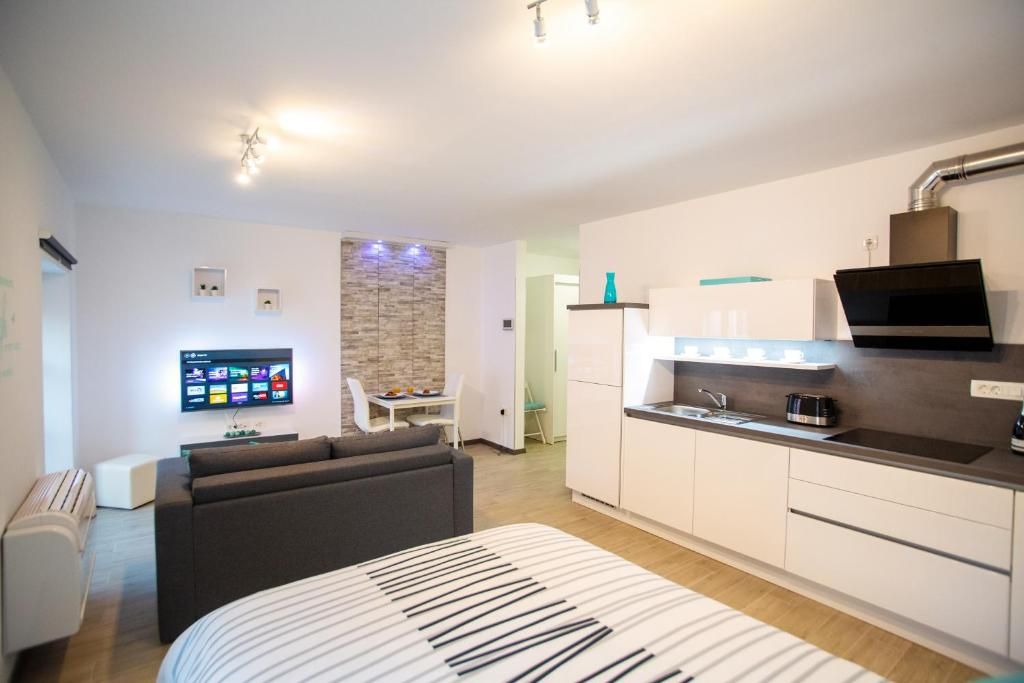 Z moderno opremljeno kuhinjo, udobno dnevno sobo in prostorno spalnico je idealen za pare ali manjše družine.