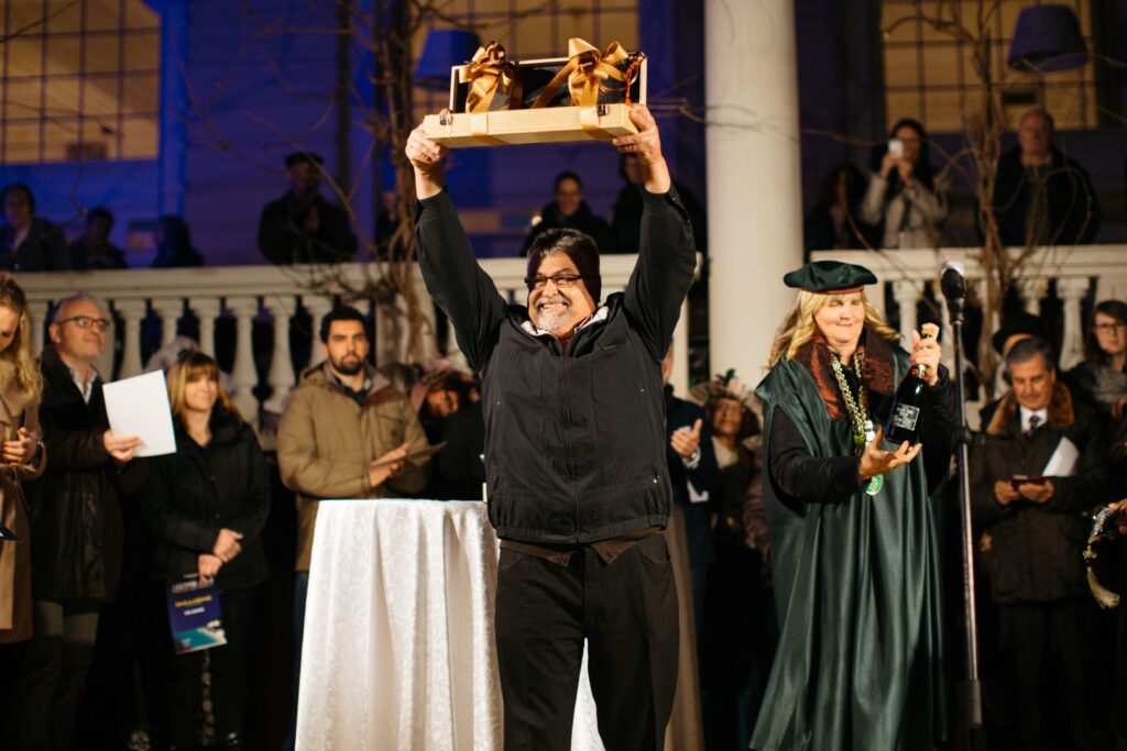 Rebula prejel iz rok župana občine Piran Petra Bossmana v družbi