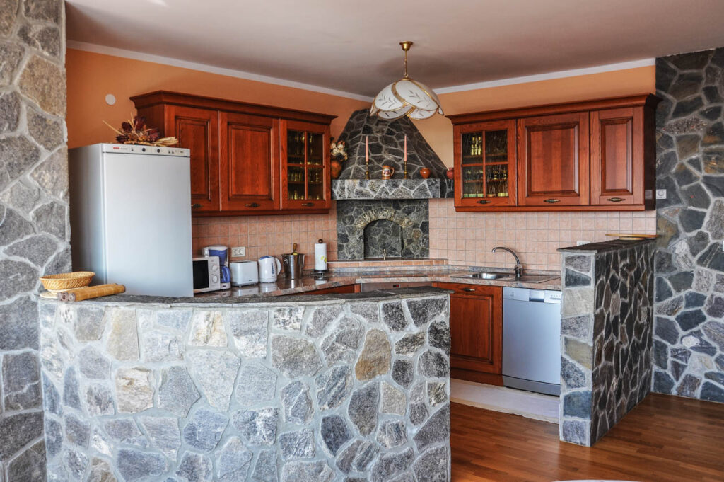 - Kuhinja: popolnoma opremljena kuhinja, jedilnica, pomivalni stroj, steklokeramični štedilnik z ventilacijsko pečico, hladilnik z zamrzovalnikom, električni žar, mikrovalovna pečica, kavni aparat, toaster, grelnik vode